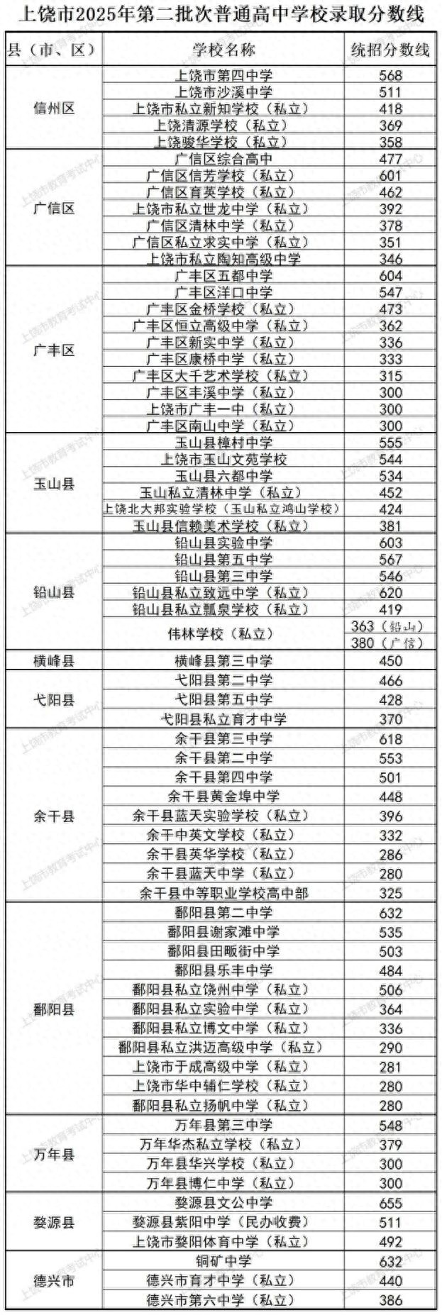 按照上饶市2025年第二批次普通高中学校招生计划、考生初中学考志愿及初中学考成绩,划定了录取分数线。现发布如下: