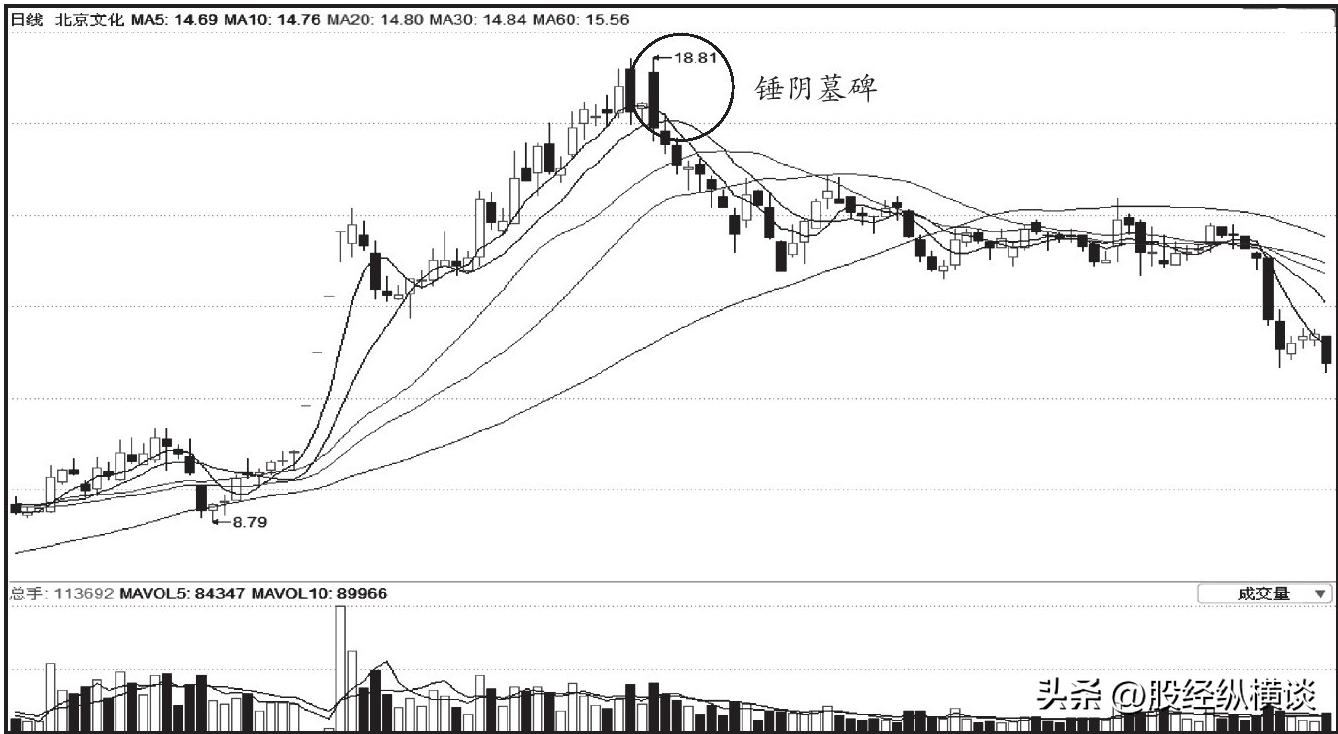 在股价高位出现单锤就可怀疑是头部,如果再出现阴线跌破单锤,就更要引起警惕,特别是带量的锤子线和阴线组成的锤阴墓碑,形成头部的概率更大。