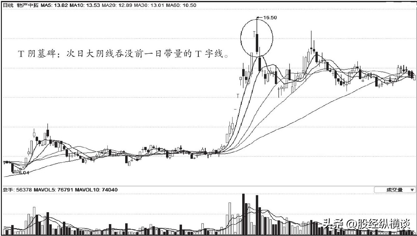 T字线是一个上下宽幅震荡的过程,开盘价、收盘价在同一价位且为最高价;而单根长阳线是上扬行情,最终收盘在最高点。在一定意义上,可以把一根T字线视同为一根阳线,那么T字线和长阴线的组合,也就类似阴阳墓碑的头部特征。为了便于记忆,我们把一根T字线和一根长阴线组成的头部形态,称为T阴墓碑。