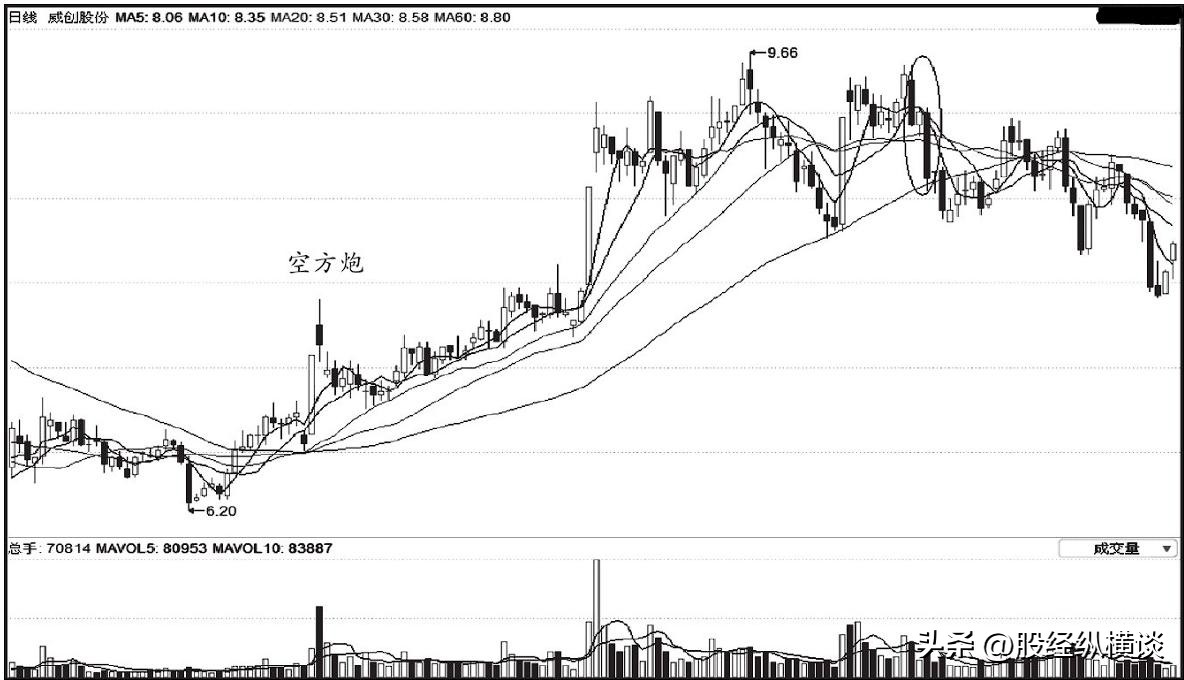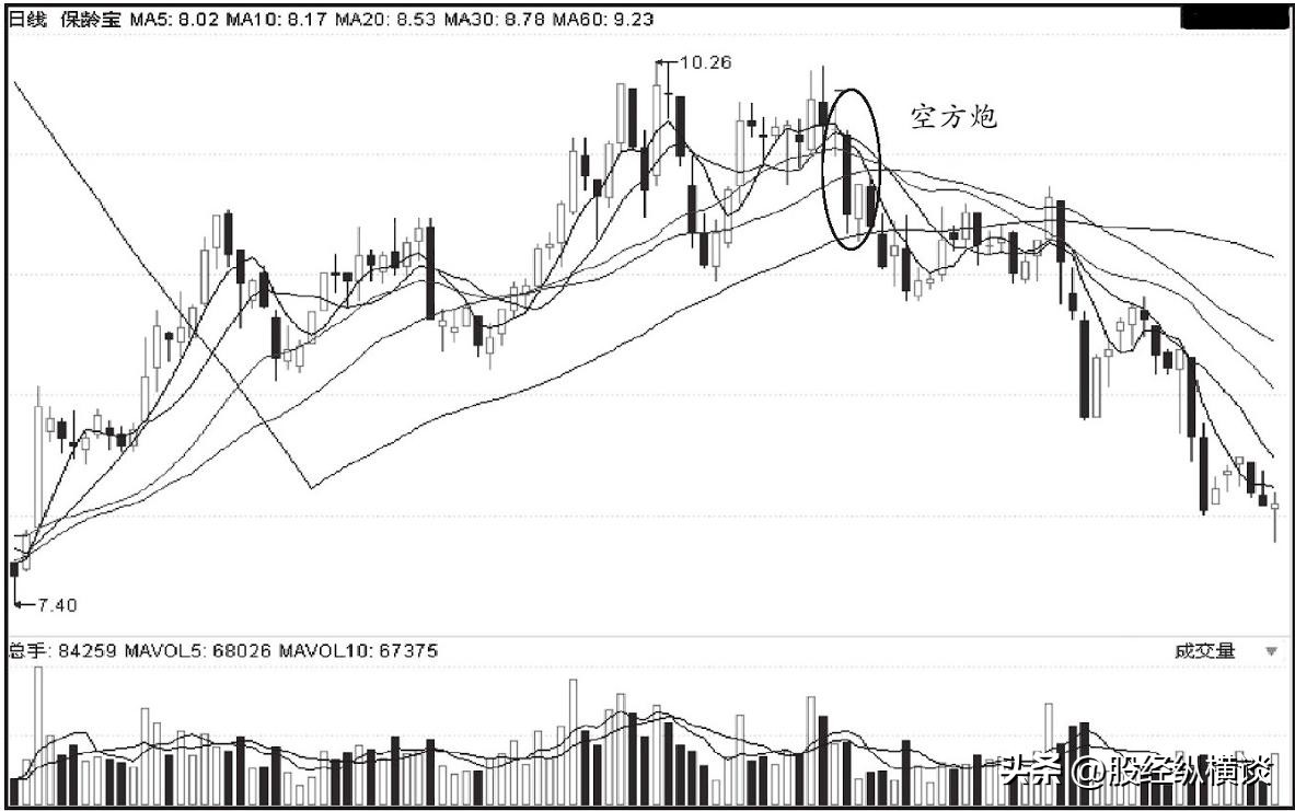 空方炮是股价宽幅震荡的结果,如果出现在长期上涨的个股中,则获利压力大增,说明庄家已经在反复震荡中出货了。