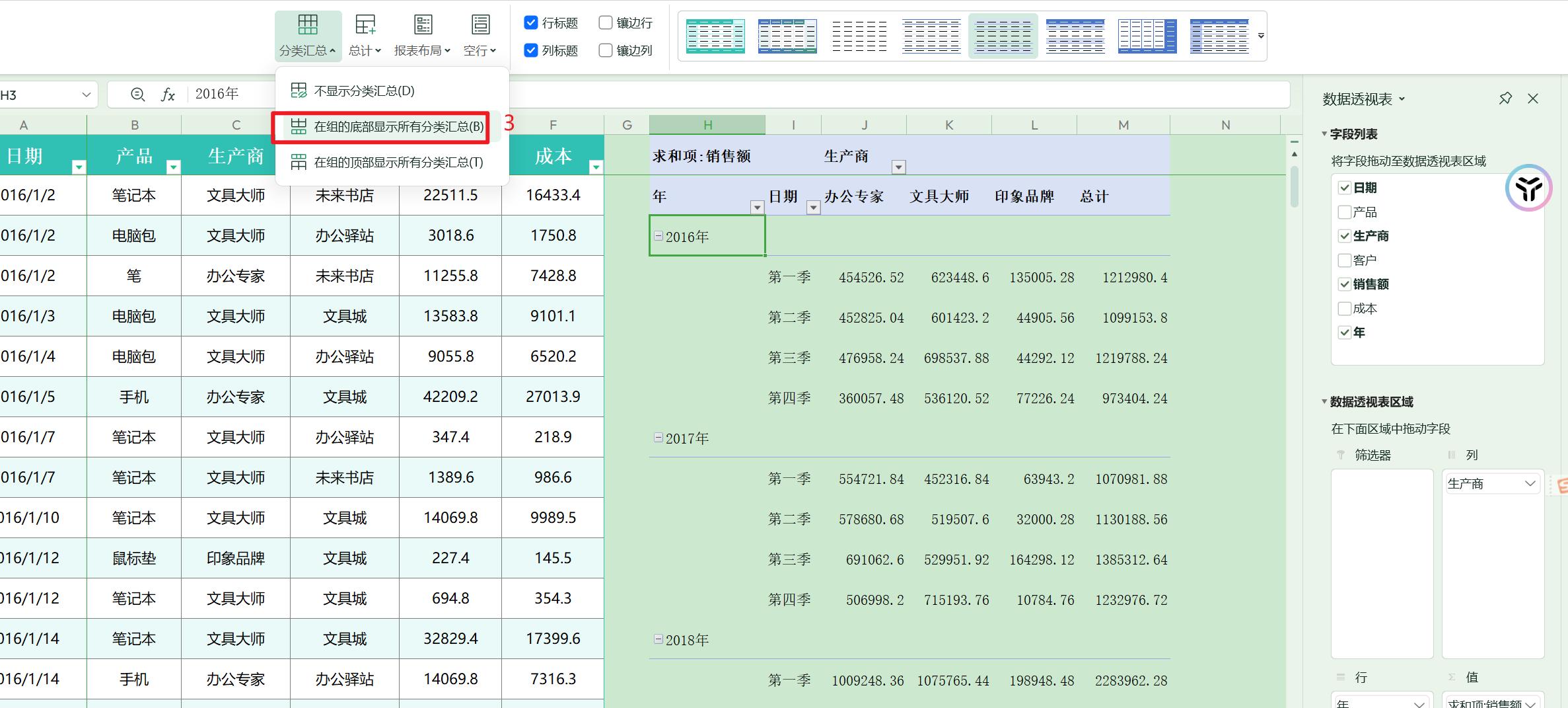 假设我们拥有2016-2018年三年的统计数据,现在老板让把这三年期间的销售、成本数据,按照季度汇总一下