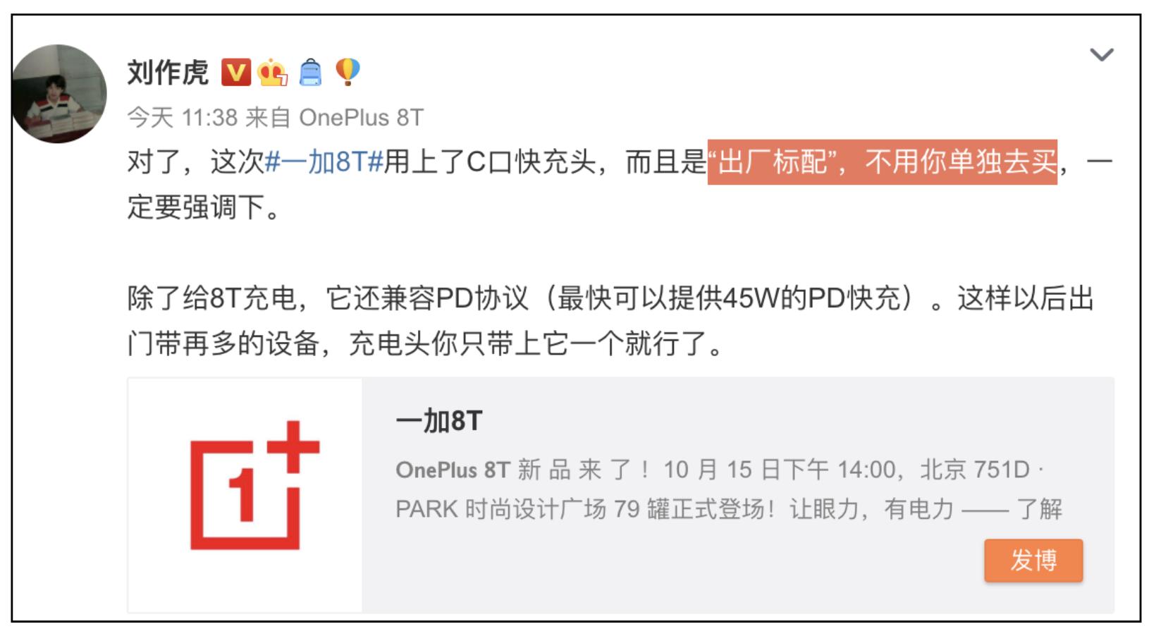 说起来,一加机型的闪充功能一直是其的一个亮点,无论是此前的Dash闪充还是Warp闪充,都支持边玩边快充,对于一些喜欢一边玩游戏一边充电的朋友来说,不会出现“充了半天却没充上”的尴尬情况。但是此前的一加闪充头是不支持其他协议的,因此只能“专头专用”。这一次兼容PD快充协议,适配更多的设备,对用户来说是一件好事。同时刘作虎还在微博上强调,一加8T的快充头是“出厂标配”,不用单独去买,嗯……