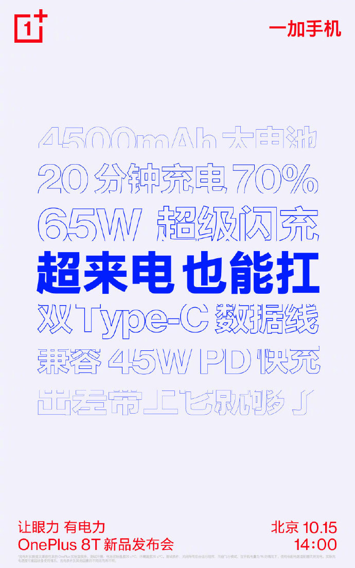 9月22日,一加公布了最新机型一加8T的发布消息:10月15日在北京进行线下发布,发布会主题为“让眼力,有电力”。根据发布会主题,很多网友猜测新机的升级点跟屏幕、续航有关,一加官方的消息也证实了这种猜测。继前两天曝光了一加8T的屏幕之后,今天透露了更多一加8T“有电力”方面的消息。