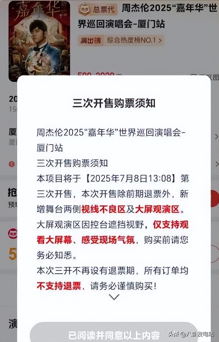 无独有偶的是,今年7月8日,周杰伦演唱会厦门站门票第三次开售。