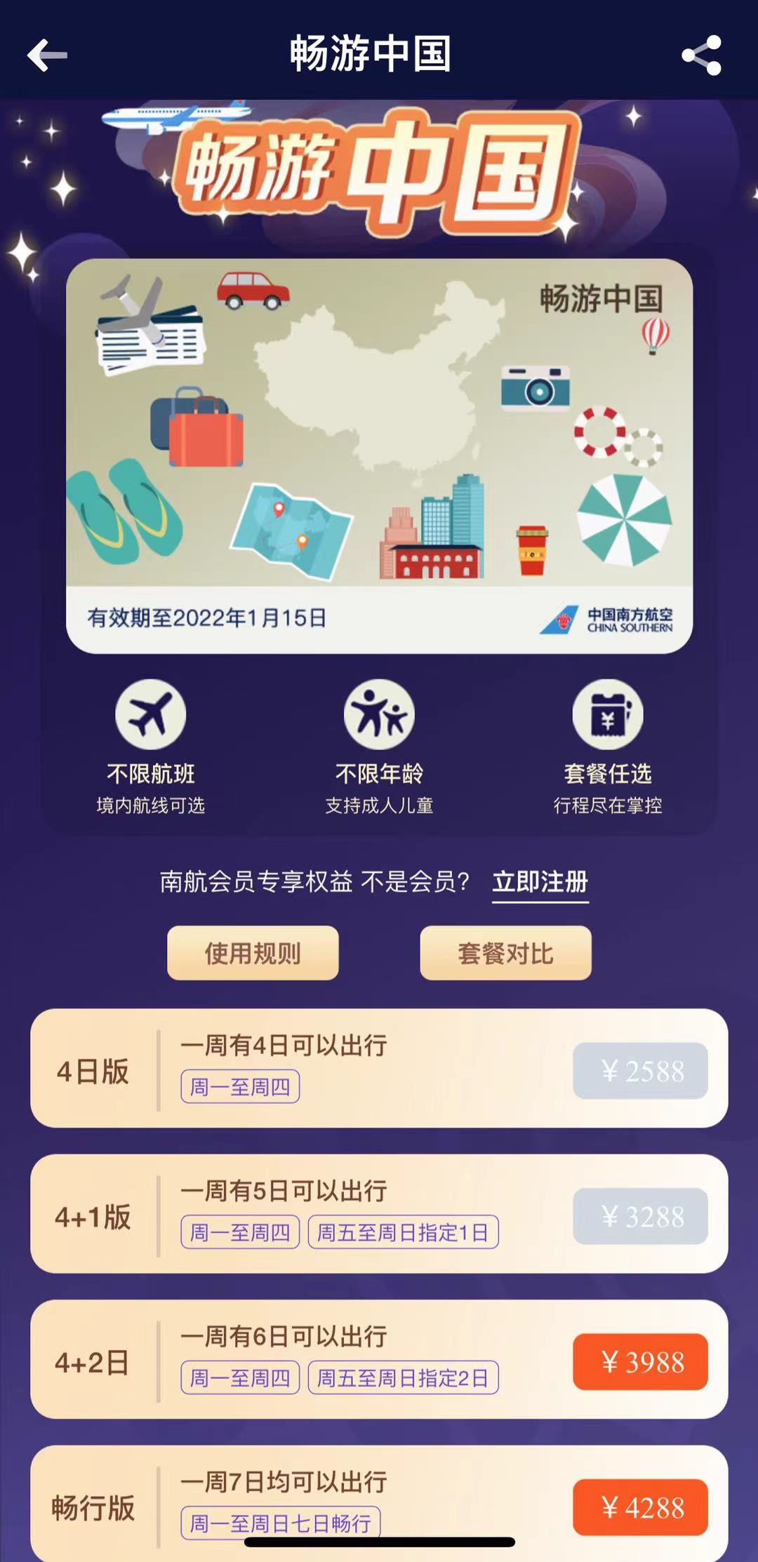主打“不限航班、不限年龄”的南航快乐飞,此次推出的3.0版包含四款套餐,其中,4日版指出行日期为周一至周四4天,4+1版指出行日期为周一至周四、周五至周日指定1日,4+2版指出行日期为周一至周日、周五至周日指定2日,畅行版为周日至周日七天均可出行。