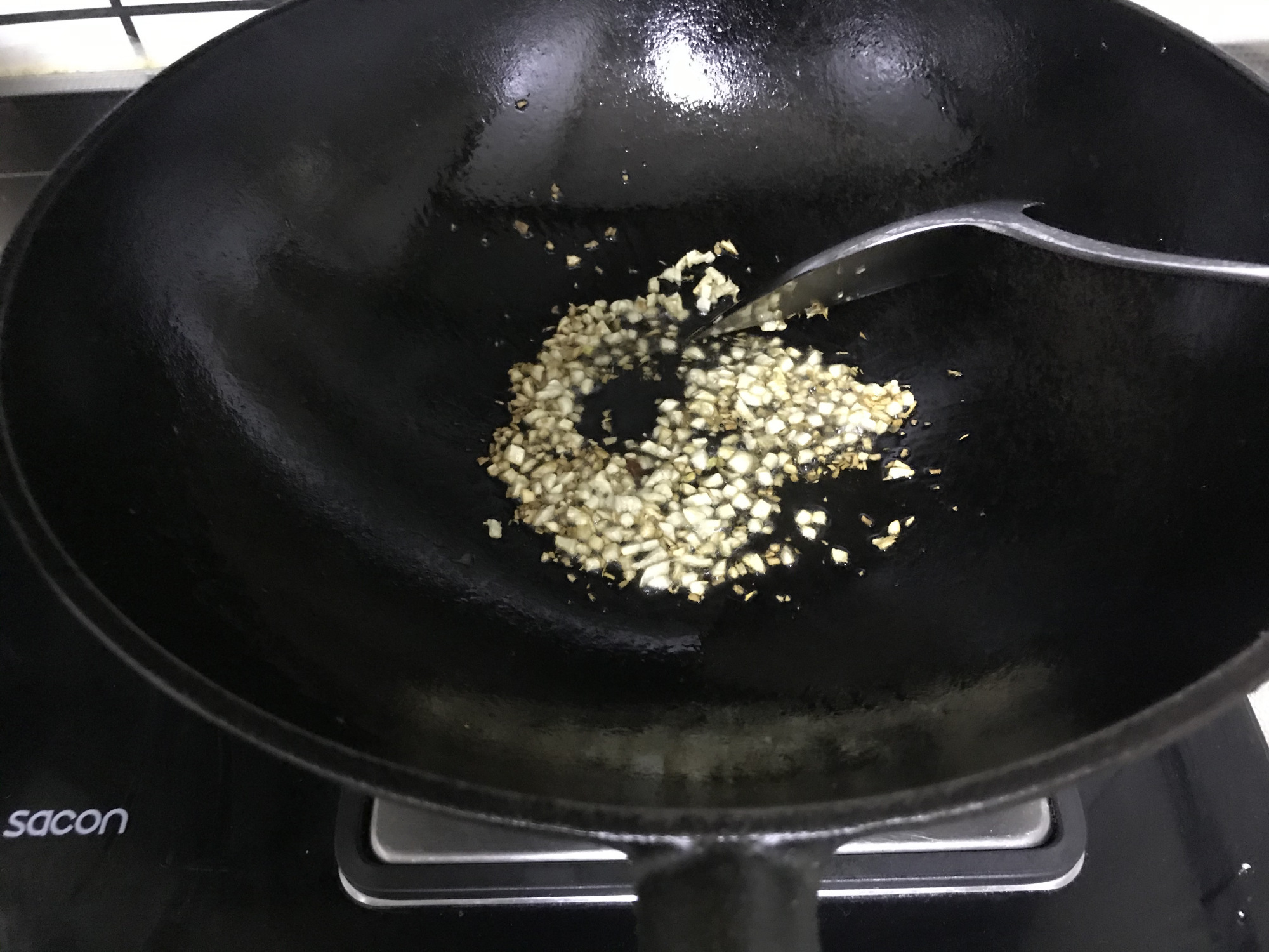 4、锅中放入适量底油,将切好的蒜末,取其一半放入炒锅中,将其炒至蒜香味,且呈金黄色即可,如图所示。