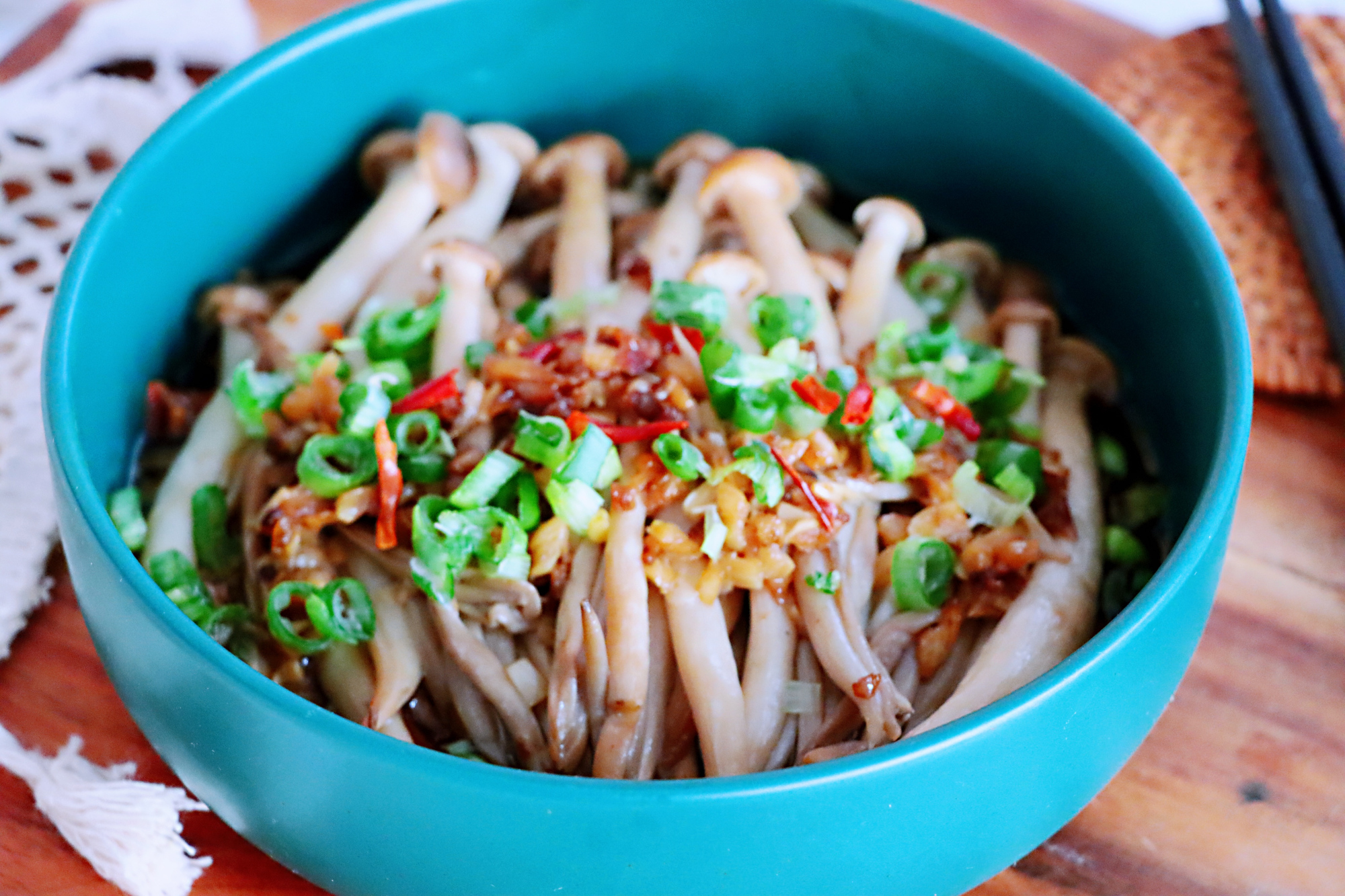 食材用料:蟹味菇1包、葱1棵、蒜6瓣、轻盐酱油适量
