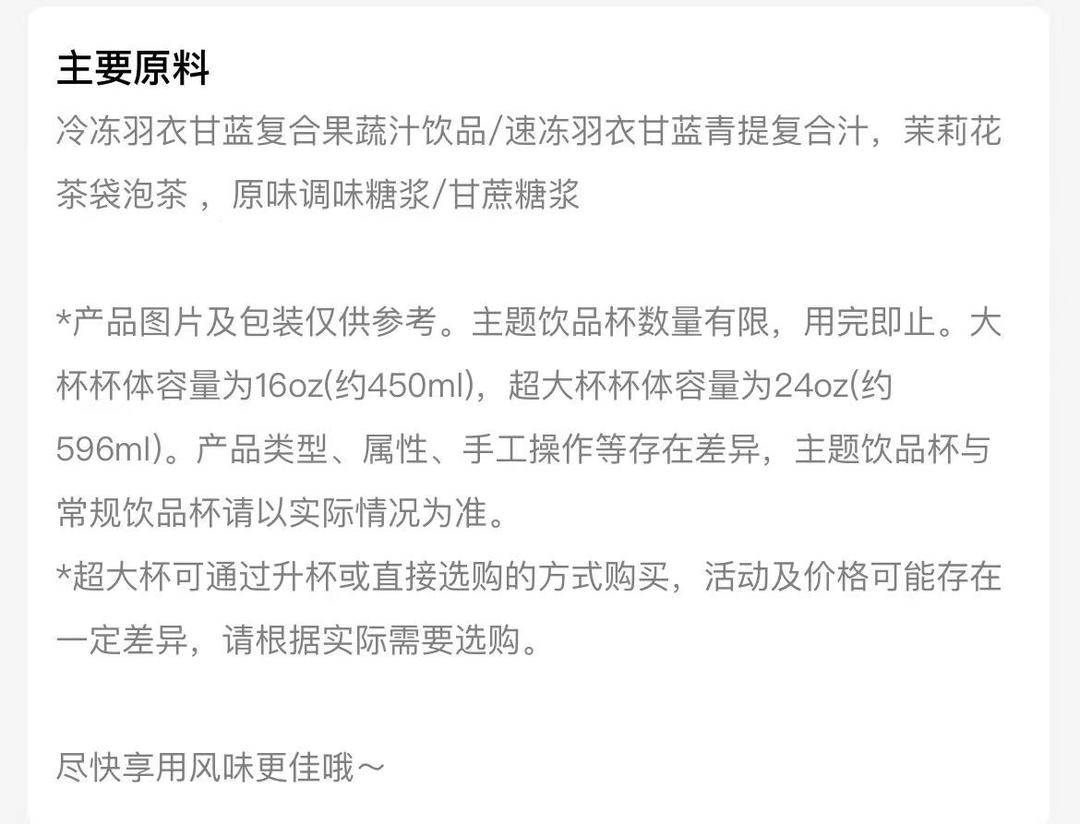 近日,咖啡品牌瑞幸也推出了羽衣轻体果蔬茶。在商品详情页面显示,该款羽衣轻体果蔬茶饮品包括4种果蔬搭配,除羽衣甘蓝外,还添加了阳光玫瑰青提、红富士苹果、尤力克黄柠檬。下方主要原料标注为冷冻羽衣甘蓝复合果蔬汁饮品/速冻羽衣甘蓝青提复合汁,茉莉花茶袋泡茶,原味调味糖浆/甘蔗糖浆。