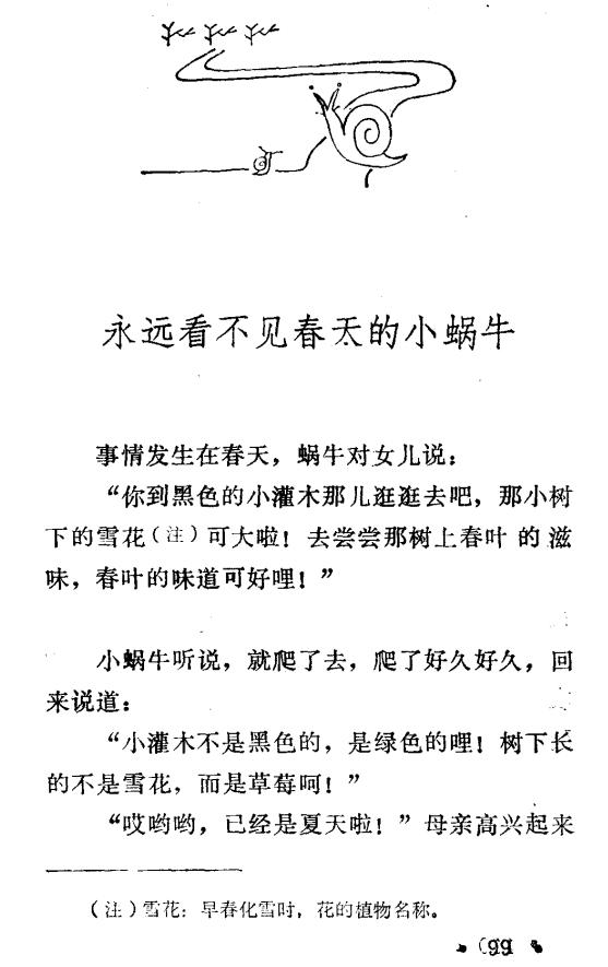 在《成年人童话》中,收有日后成为小学一年级课文《小蜗牛》的本真面貌的一篇童话。