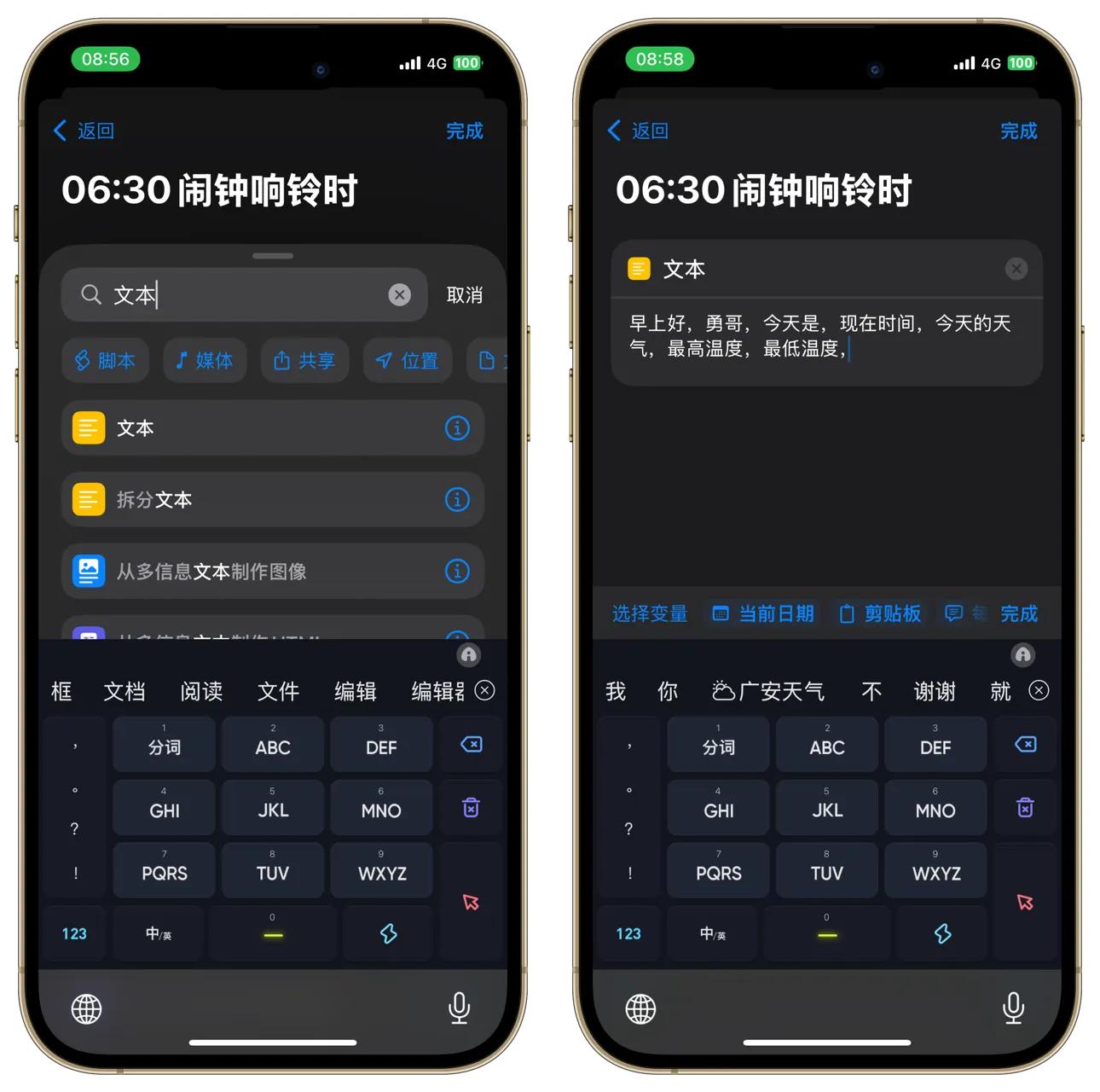 移动光标在需要的位置,然后点选键盘上方的变量,“今天是,”后面添加当前日期,“现在时间,”后面添加当前时间……