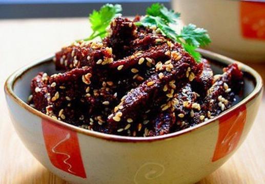 点评:风干牛肉是一道地道的草原乡土菜,很久以前,人们为了使食物能长时间保持不发霉,把牛羊肉煮熟后晾成干带在身上,风干牛肉和一些风干菜就这样流传下来了。现如今,经过数代人的改进,风干牛肉早已成为餐桌上的宠儿,饭店里通常都是大批量制作,常做为凉菜出品。