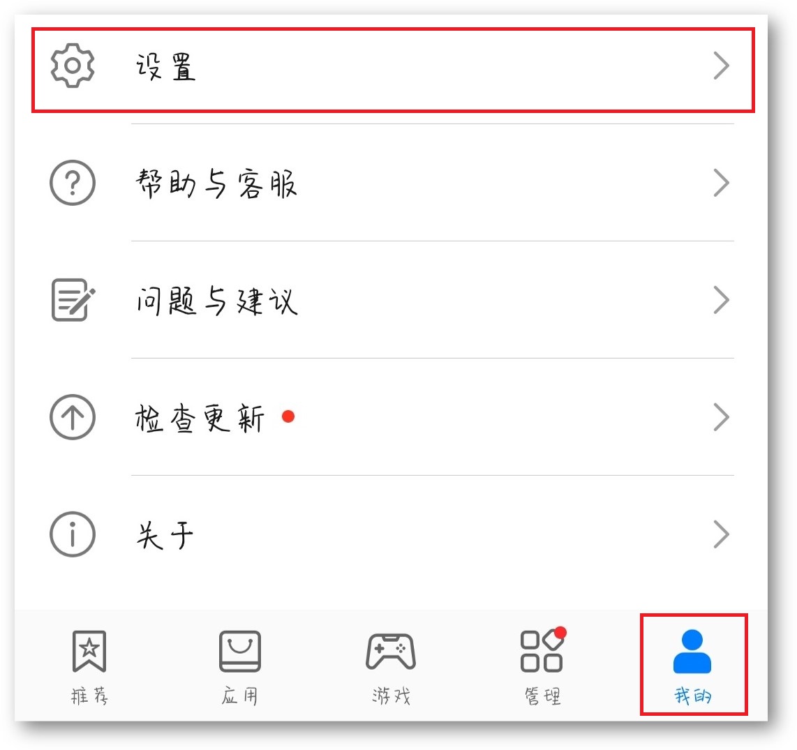 打开手机上自带的应用市场,点击右下角【我的】,进入到用户管理界面,然后再点击【设置】。