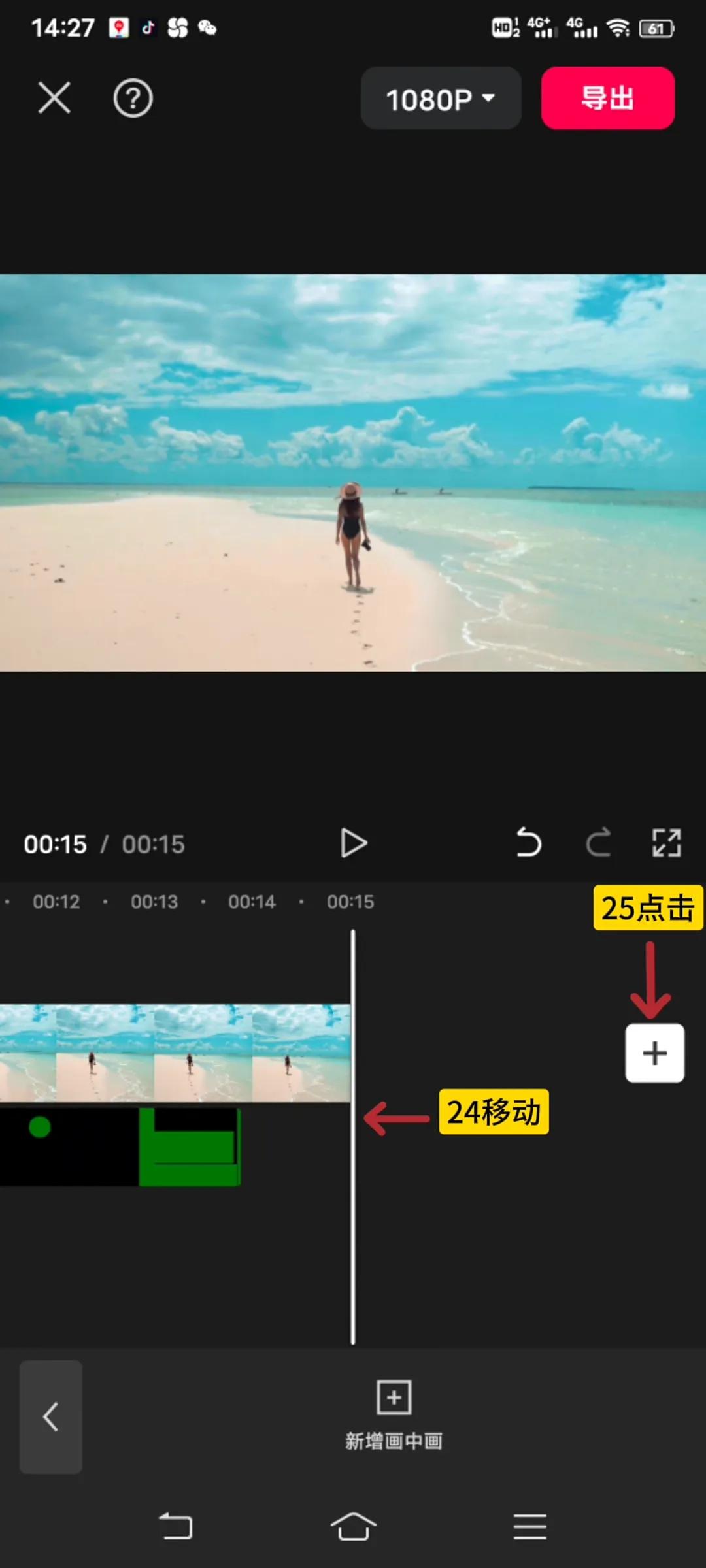 因为绿幕有音乐,可以用绿幕音乐,如果没有自己配上音乐,想继续添加素材的话,就把时间轴移动到主轨道视频末尾位置,点击后面的加号,如图14-25所示。