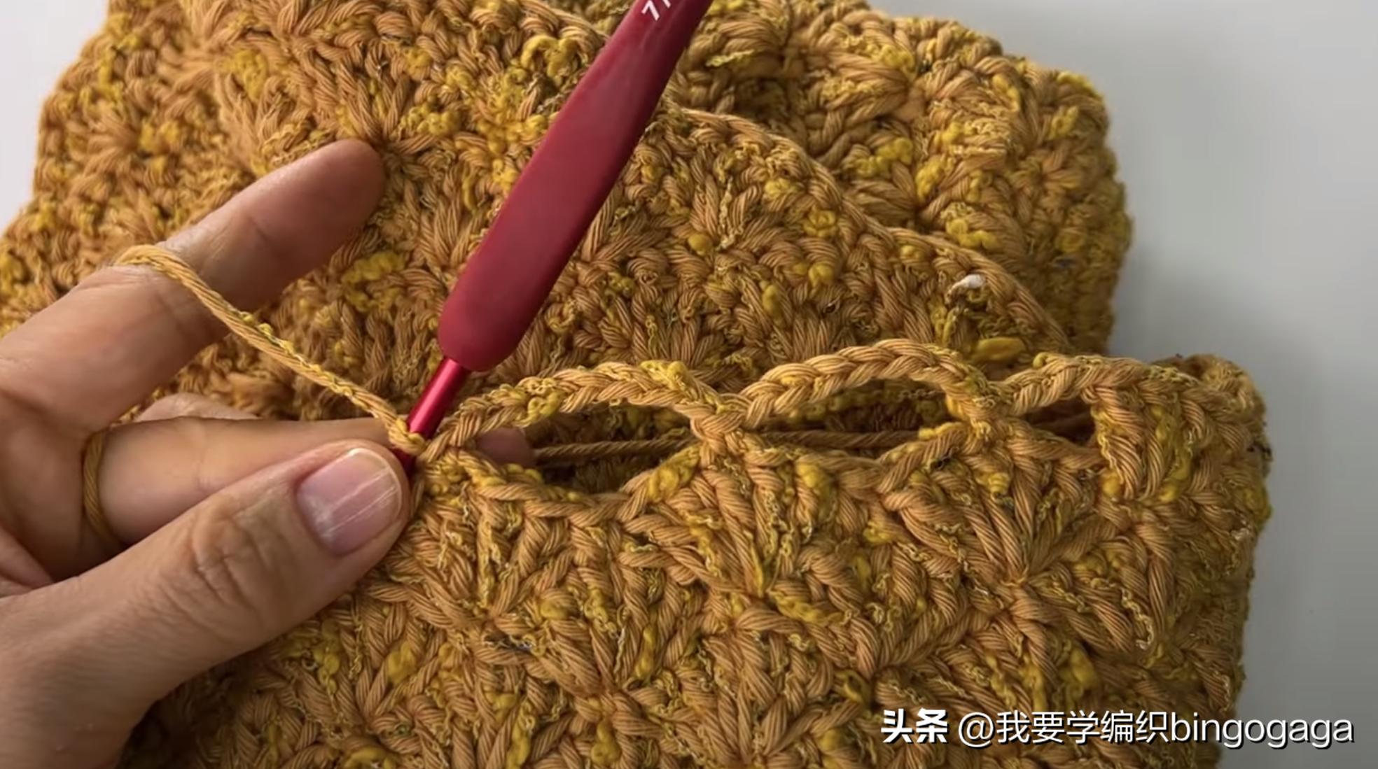 后面就重复这样的规律钩到所需的高度(示范款钩到了16圈),然后断线。接着我们从图示位置入针,开始钩包带部分。第1圈:入针处先钩1短(5长中心针),后面的短针上钩5长,5长的中心针上钩短针,再下个短针上钩3长3锁,在后面5长中心针上钩1短7锁,再在下个5长中心针上钩1短7锁,再到下个5长中心针上钩1短3锁,在下个短针上钩3长,再到下个5长中心针上钩短针,短针上钩5长,5长中心针上钩短针。