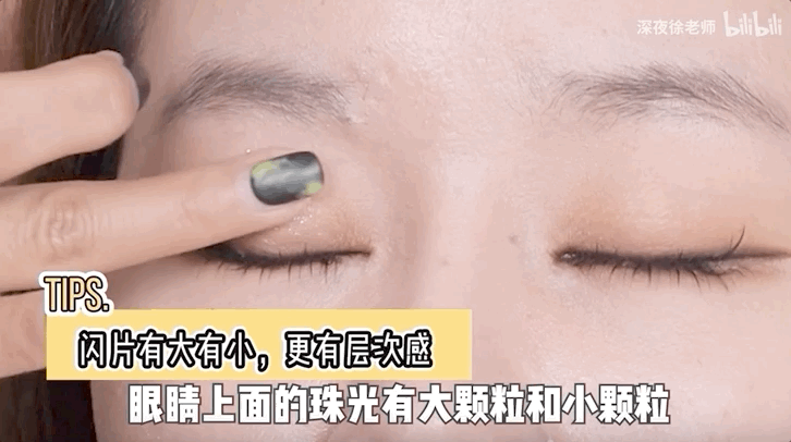 最后,我们用亮片液体眼影涂在留白处再叠加上欣欣子同款的大闪片就OK啦~(如果想要自然妆效,记得免除这一步。)