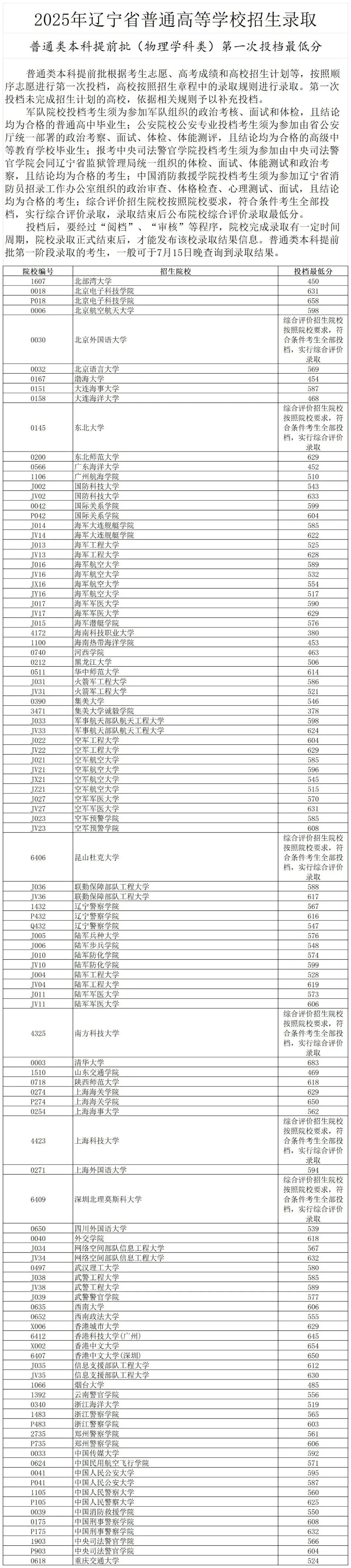 2025年辽宁省普通类本科提前批第一次投档最低分公布