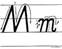 书写: 大写字母占中上格,三笔写成,每笔都是从上往下写,小写字母占中格。