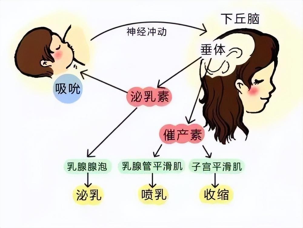 《美国儿科学会母乳喂养指南》中是这样写的:当宝宝张开的小嘴触碰到你的乳/头和乳/晕时,神经细胞会向你的大脑发送信号,从而刺激你的身体开始分泌后叶催产素,后叶催产素会刺激乳房内的肌细胞收缩,从而将泌乳细胞产生的乳汁挤出,随后,乳汁随着乳腺管流动,从乳头上的出乳孔流出,宝宝吮吸时会把乳汁从乳房内吸到自己嘴里,这会刺激你的身体分泌后液催产素,从而促使乳汁流入乳腺管,这一过程叫做排乳反射。