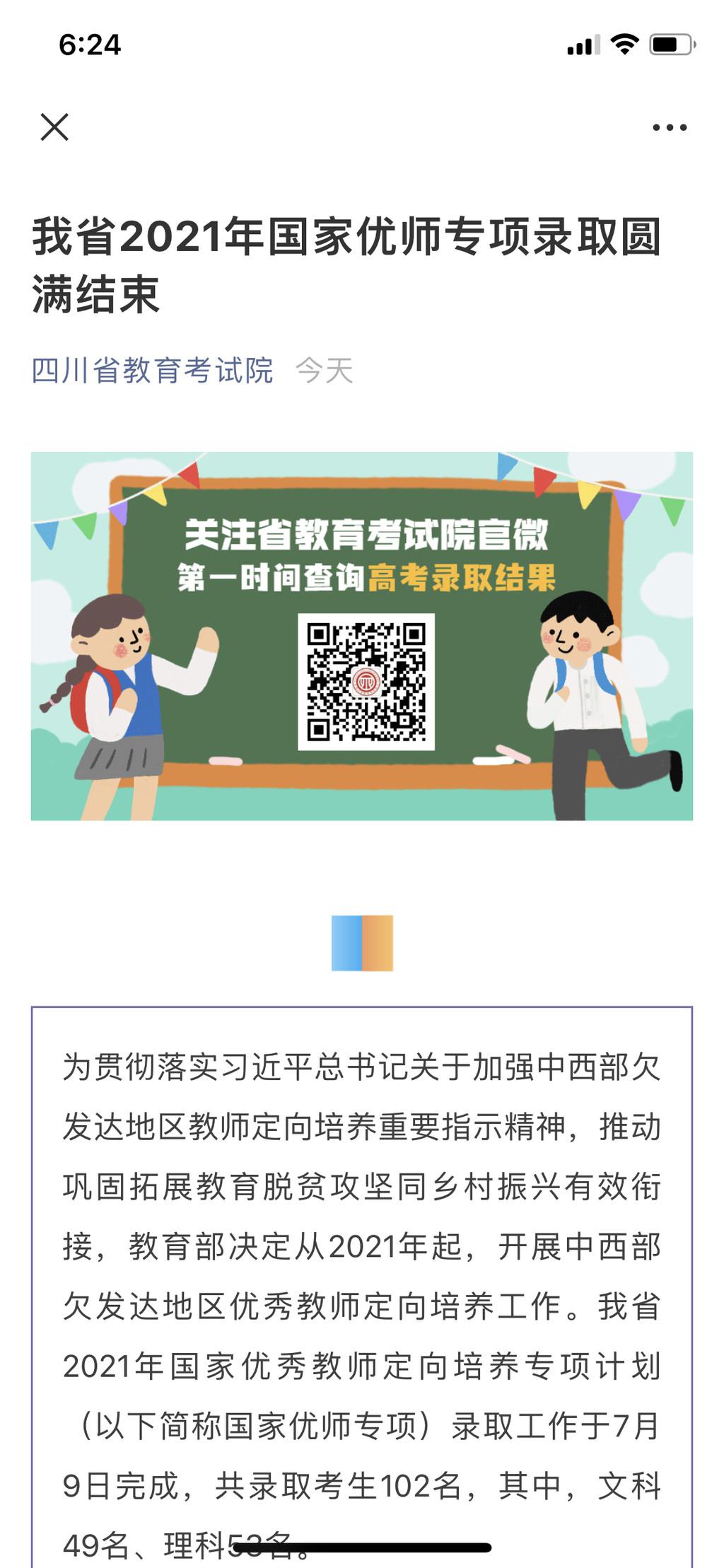 四川2021年国家优师专项录取结束,首年共录取考生102名
