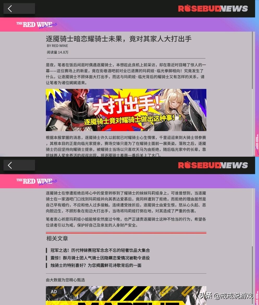 在近期的活动里可以看到很多玫瑰报业出品的花边新闻,比如“逐魇骑士暗恋耀骑士未果,竟对其家人大打出手!”这个标题是不是贼吸引人的眼球?里面的内容大概是这样的:“逐魇骑士在酒吧门口对耀骑士·临光大打出手,主要原因是他向耀骑士提亲,然后耀骑士告诉他自己只喜欢天马,随后靠两姐妹奖金养活的临光叔叔出现了,将逐魇骑士羞辱了一番后关上了大门。后来逐魇骑士把目光转向了临光的妹妹瑕光,求婚再次惨遭拒绝后因爱生恨,然后把瑕光打到在地。”话说逐魇骑士这么没原则的么?动不动就求婚,情商低的可怕!