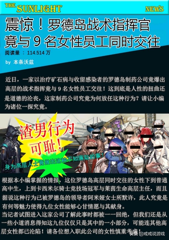 但是你以为玫瑰报业集团是好惹的吗?那你就大错特错了,在泰拉大陆的第二天就出现了这样一篇点击量极高的报道:“震惊!罗德岛战术指挥官竟与9名女性员工同时交往!”虽然大家都知道这个十有八九是来自于对手的诋毁,但是也有人说并不是完全捕风捉影,那么你觉得呢?