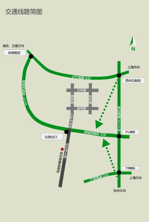 3、南京、无锡方向 沪宁高速,上海方向→绕城西南线一石湖收费站出口下一苏州湾大桥一苏州湾黄金湖岸旅游区