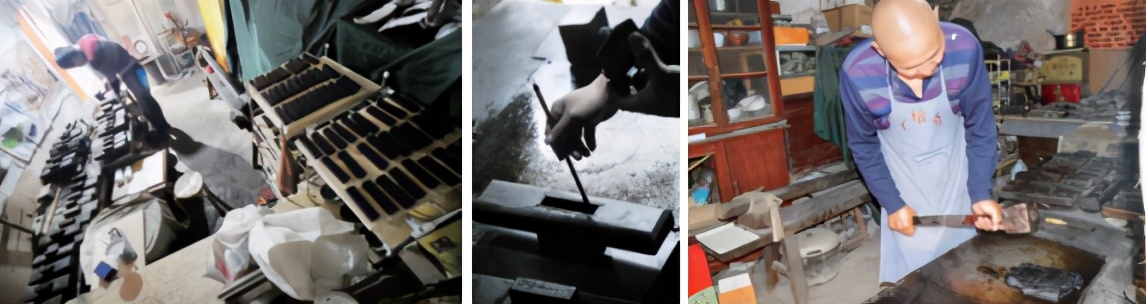 将不规则的墨坯制成规则的墨块,同时也会采用不同的模具做出不同的制式,然后在进行边边角角的一些修剪。