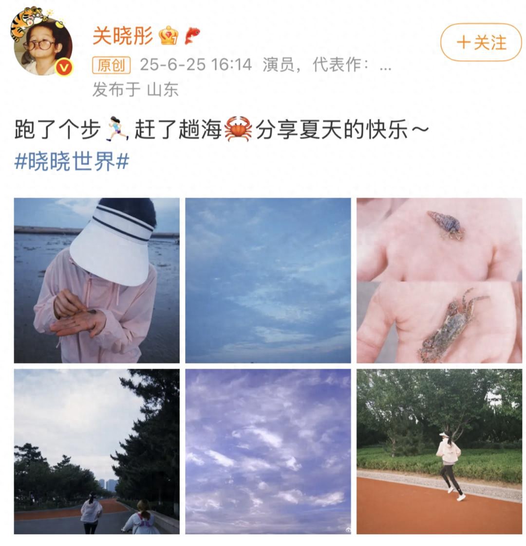 昨日,国民闺女关晓彤在个人微博晒出一组元气满满的赶海照片,配文:“跑了个步️赶了趟海,分享夏天的快乐”,引发网友热议。