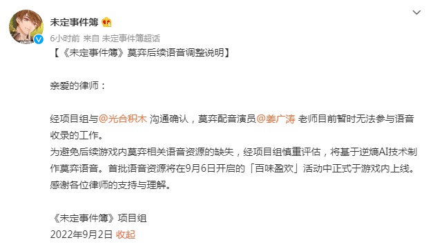 9月2日,游戏未定事件簿发布关于游戏角色莫奕语音的调整说明,未定事件簿项目组与光合积木进行沟通后确定,原游戏角色莫奕的配音演员姜广涛目前无法参加语音收录的工作,为了避免游戏内与莫奕相关的语音资源丢失,经过项目组的慎重评估,将基于逆熵AI技术制作莫奕语音,首批语音资源将会在9月6日开启的“百味盈欢”主题活动中正式上线。同日,未定事件簿发布了“百味盈欢”主题活动的宣传视频,其中莫奕一角也出现在了宣传视频中,当前该宣传视频的角色配音表显示莫奕的配音为“莫奕”,其他游戏角色仍由原配音演员进行配音。