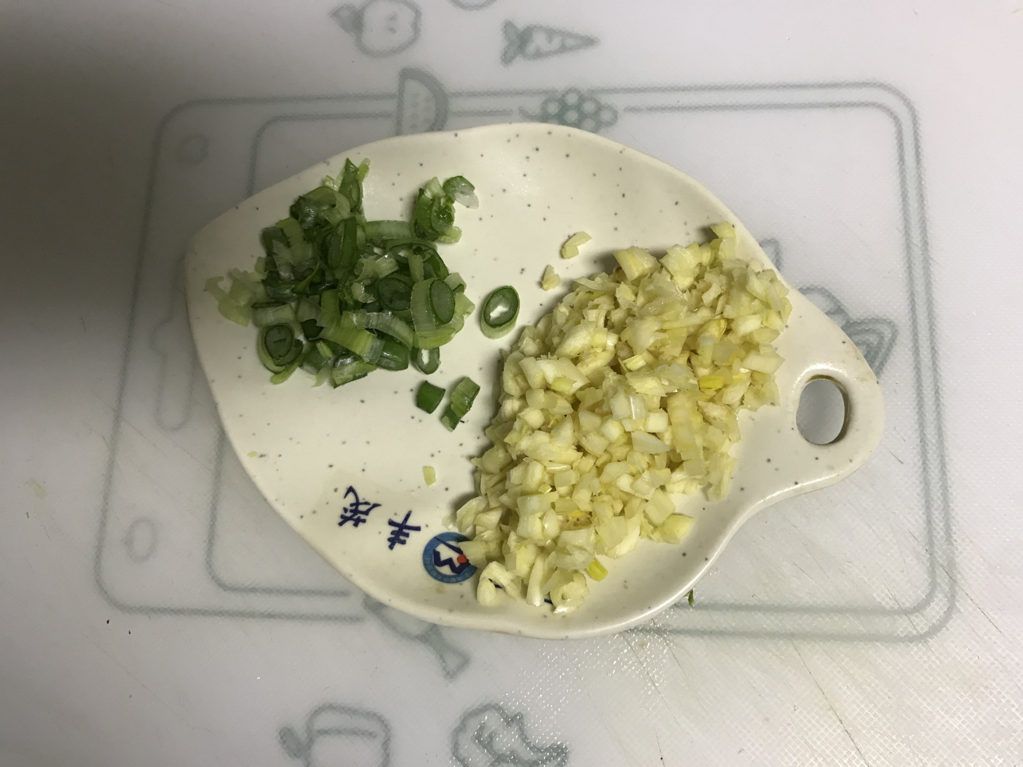 3、将准备好的小葱切碎,蒜瓣切成末,如图所示。