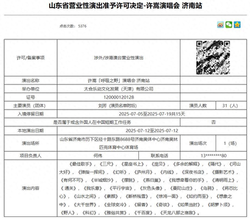 许嵩2025“呼吸之野”演唱会济南站获批!