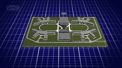 监狱中央是一座5层楼高的支援大楼,正中间是控制中心。两边是四座牢房区。