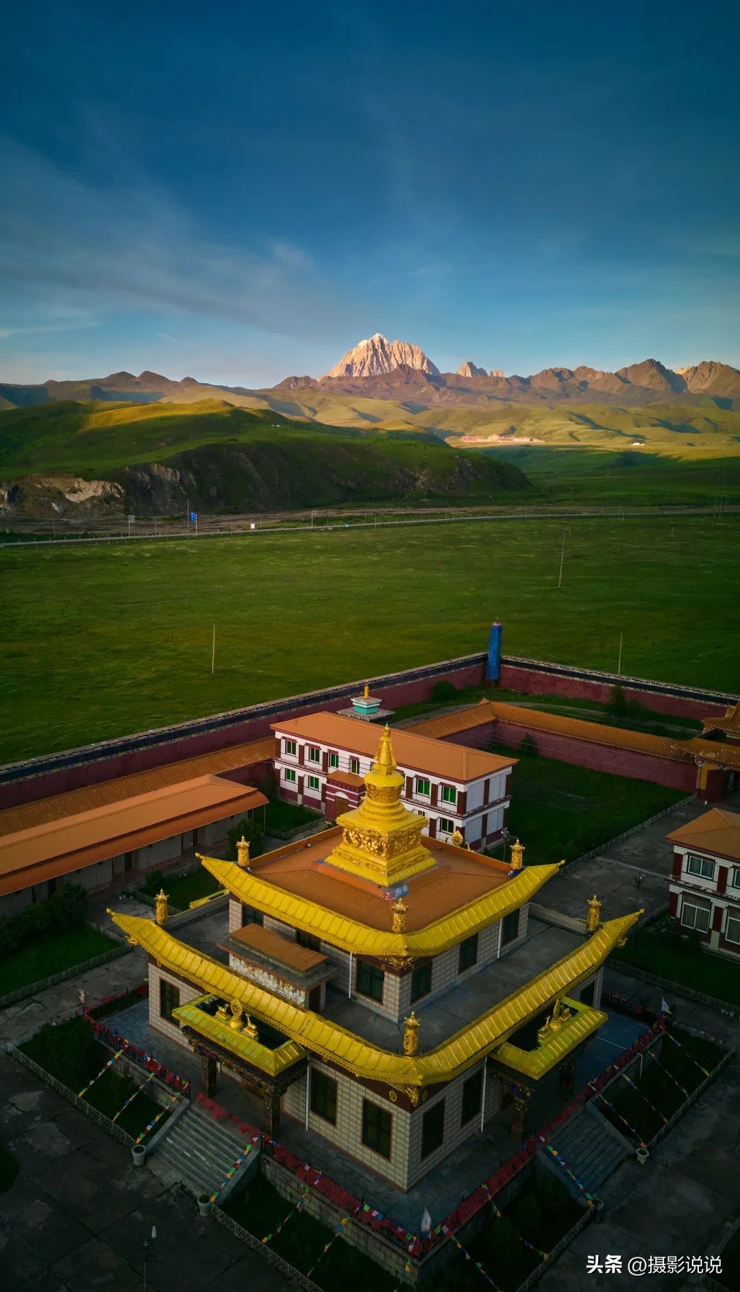 这张照片拍摄的是雅拉雪山与金寺的合影,使用大疆mini3无人机竖拍得到不一样的视角,日落时的金光洒向雪山和寺庙的房顶,神圣而优雅。