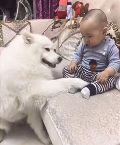 狗狗不仅会照顾怀孕的女主人,帮忙带娃也是有两把刷子的,看这萨摩的样子,像极了上岗的保姆哈哈哈。但是小主人似乎还没能接受狗狗哦,毕竟以他这个程度的智商,可能还不能理解会有狗狗这么大个毛绒玩具的存在。