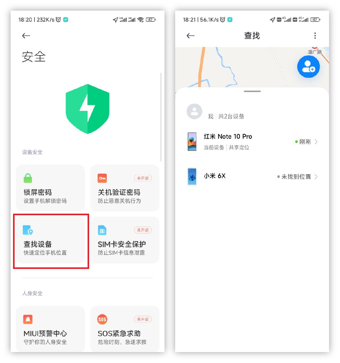 如果你另一台手机丢失了,可以打开设置-安全-查找设备,这样就能快速定位到你的手机位置,手机丢失可以借用这个方法找回。