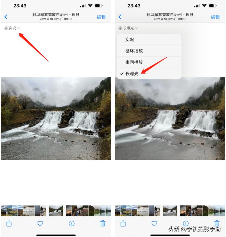 这是实况模式最典型的用法,我们重点看一下照片中的瀑布,呈现出了一种拉丝的长曝光效果。下面我就详细介绍一下苹果手机的实况模式以及相关的使用技巧。
