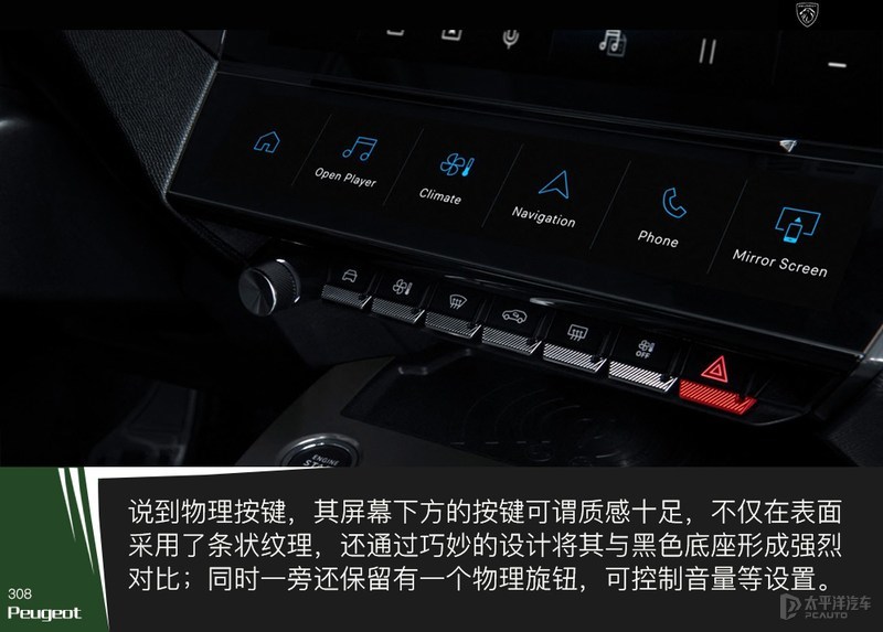 此外,全新308还取消了传统空调面板转而将其与车机系统进行融合,可通过下方的空调快捷键,一键进入屏幕内的空调设置UI。