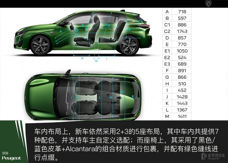 车身尺寸上,全新标致308的长宽高分别为4367/1859/1441mm,轴距为2675mm;对比现款长度增加了105mm,以此为车内乘客带来了更舒适的空间。