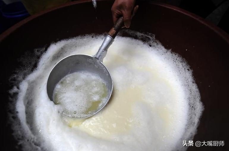 9、豆腐脑上面有一层“水”,这是酸浆,用勺子舀出来,装进瓶子里,放在冰箱里保存,下次用它来点豆腐,效果比卤水还要好。