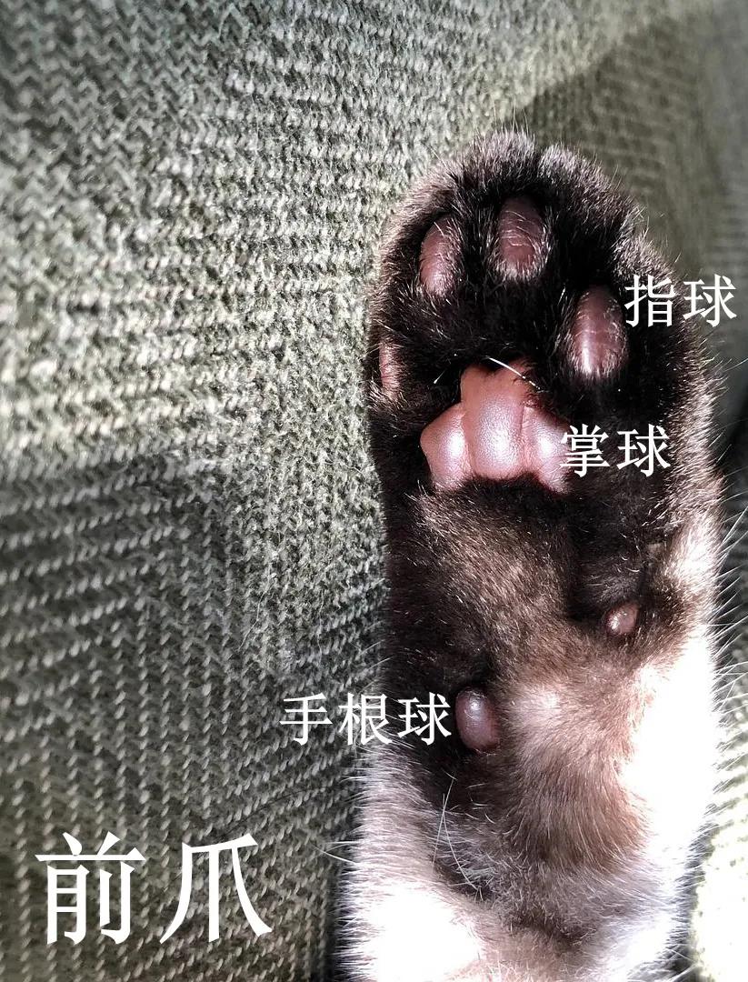 猫的前爪有5根指头(包括1根悬指)、5个指球、1个掌球、1个手跟球;后爪有4根趾头、4个趾球、1个足底球。