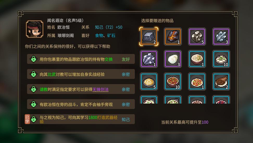 接下来我们讲一下在游戏中与NPC的人物互动这方面,我们这个游戏可以说是大侠送礼传,在游戏中给NPC送礼是一个非常关键性的玩法。在送礼界面,我们可以看到好感度好后解锁的好处,比如下图解锁好感度后,NPC会给你提供的东西,和可以传授你一些能力的经验。