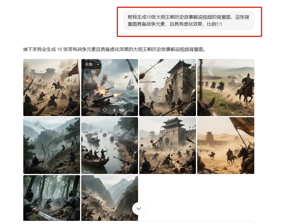 帮我生成10张大明王朝历史故事解说视频的背景图,这张背景图具备战争元素,且具有虚化效果,比例1:1