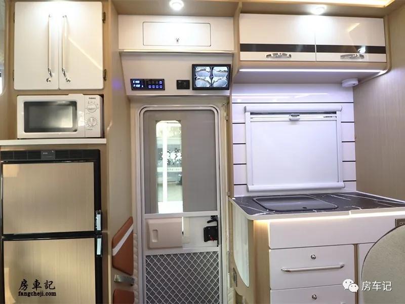 在乘客门的上方主要配置了控制面板和四路监控显示器。左侧为玄关区,配置了微波炉、储物格和双开门房车专用冰箱,容积为138L,分为冷冻区和冷藏区。右侧为厨房区域,操作台面的尺寸还是比较大的,配置方面主要有翻盖式不锈钢水槽,下方为多个抽拉柜,用于放置碗筷等物品。上方则配置了两个储物吊柜,可以放置一些厨房用品。