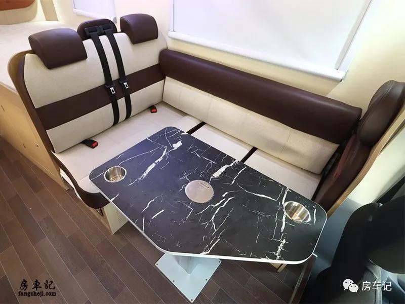 在驻车时,会客厅可满足三四个人的乘坐,在这里办公、就餐、娱乐都会非常方便。中间配置一张手动升降餐桌,降下后可拼成一张临时床铺。