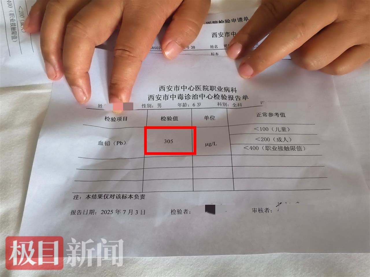 李女士称,她的孩子去年秋季也出现了症状,孩子每次吃完晚饭后都说肚子疼,后续又出现了头晕等症状,但当时都没想到是血铅有问题,只是用中药短暂地调理过。她表示,3日她和孩子同时在西安市中心医院做了检查,她的血铅检验值为25.3μg/L,儿子血铅检验值为305μg/L,两人相差超11倍。与她儿子同病房的孩子血铅检验值有420μg/L至460μg/L的,按照正常范围来讲,已经算重度了。