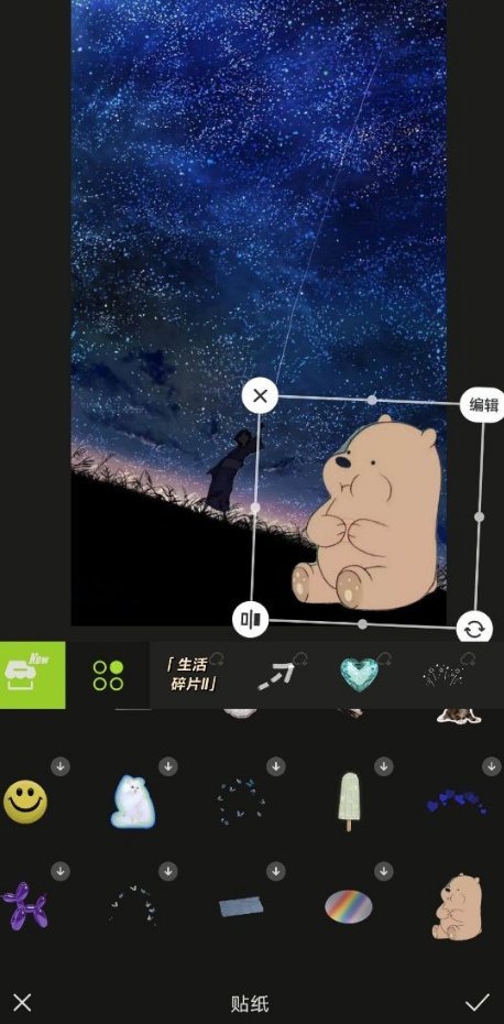 4、从图库中在添加一张图片,点击下方“智能识别”或“智能选区”进行抠图,扣好后点击对勾完成。