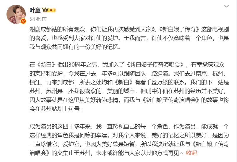 5月25日凌晨,叶童发文表示自己在《新白娘子传奇》演唱会的行程将在苏州站终止,后续不再参与。