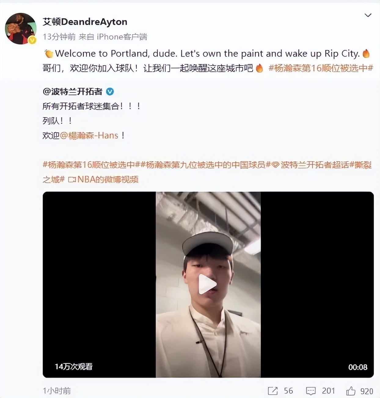 开拓者当家中锋艾顿,在个人社媒上发博祝贺杨瀚森:“哥们,欢迎你加入球队,让我们一起统治禁区&唤醒这座城市。”