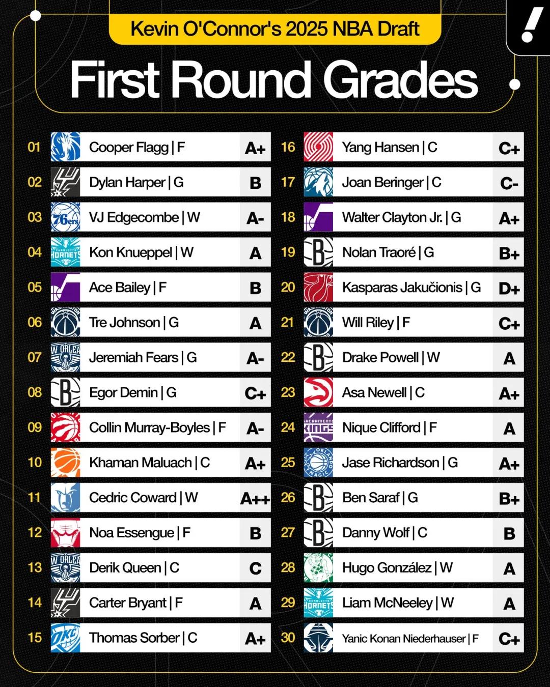 不过美媒并不太看好开拓者用首轮第16顺位选中杨瀚森的操作,名记凯文-奥康纳对此评级只有C+,而独行侠拿下弗拉格则是A+。