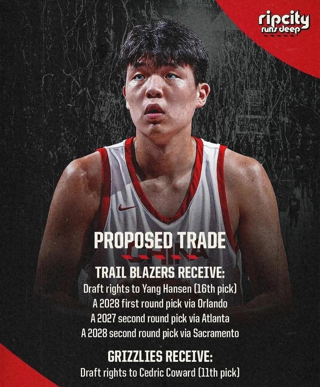 送给灰熊首轮第11顺位选中的新秀锡德里克,换回首轮第16选秀权并选中杨瀚森,还有28年魔术首轮签、27年老鹰次轮签和28年国王次轮签。
